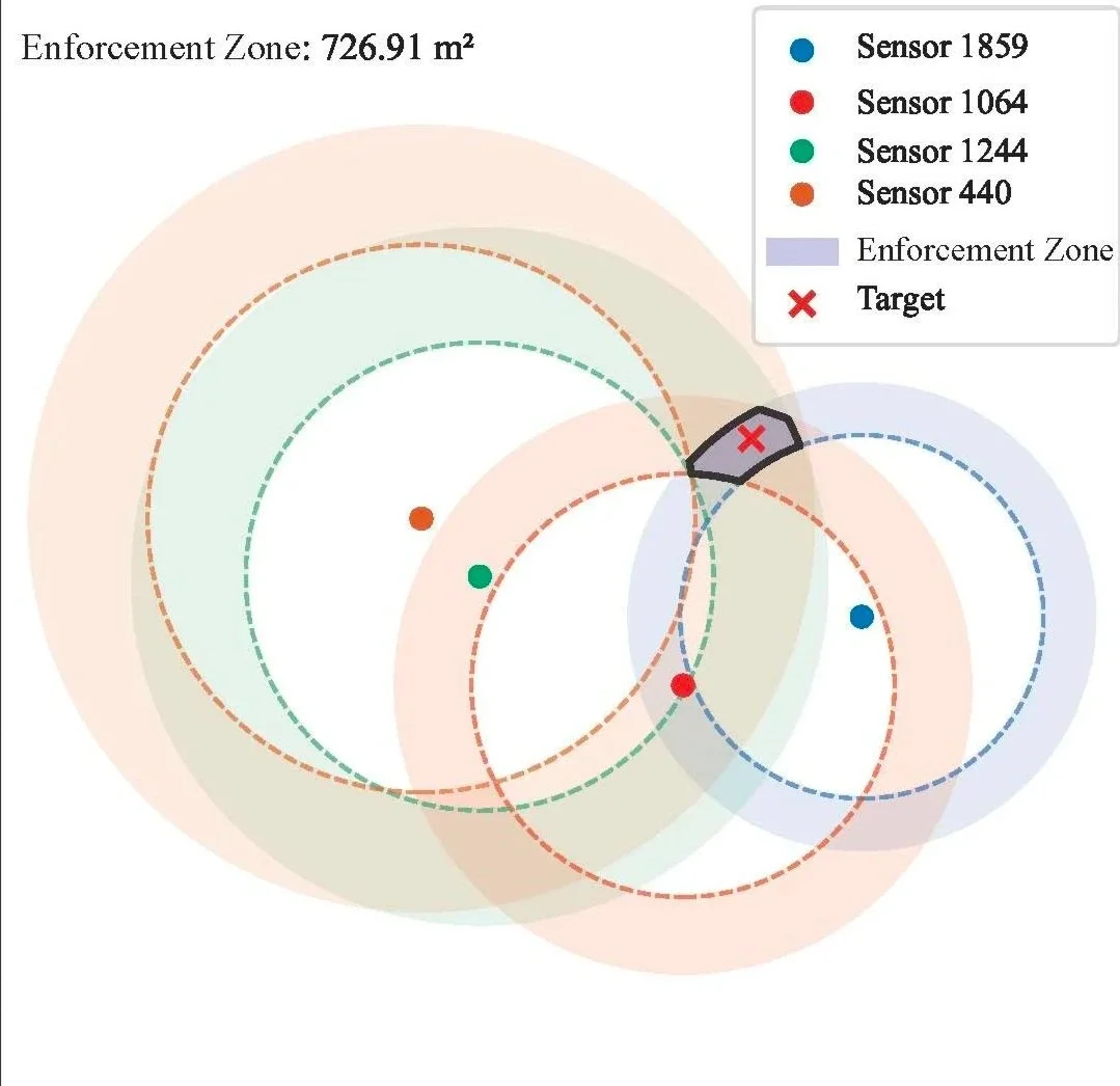 Target localization begins when validators gather sensor evidence, including signal class, sensor coordinates, and received SNR. Using the urban Hata propagation model, these measurements are converted into distance bounds, forming annular regions around sensors. The intersection of these regions defines the Enforcement Zone as a feasible polygon for the unknown target location. To improve accuracy, the framework also accounts for sources of uncertainty, such as noise and shadowing, and mitigates the effects of poor sensor geometry that can cause GDOP.
